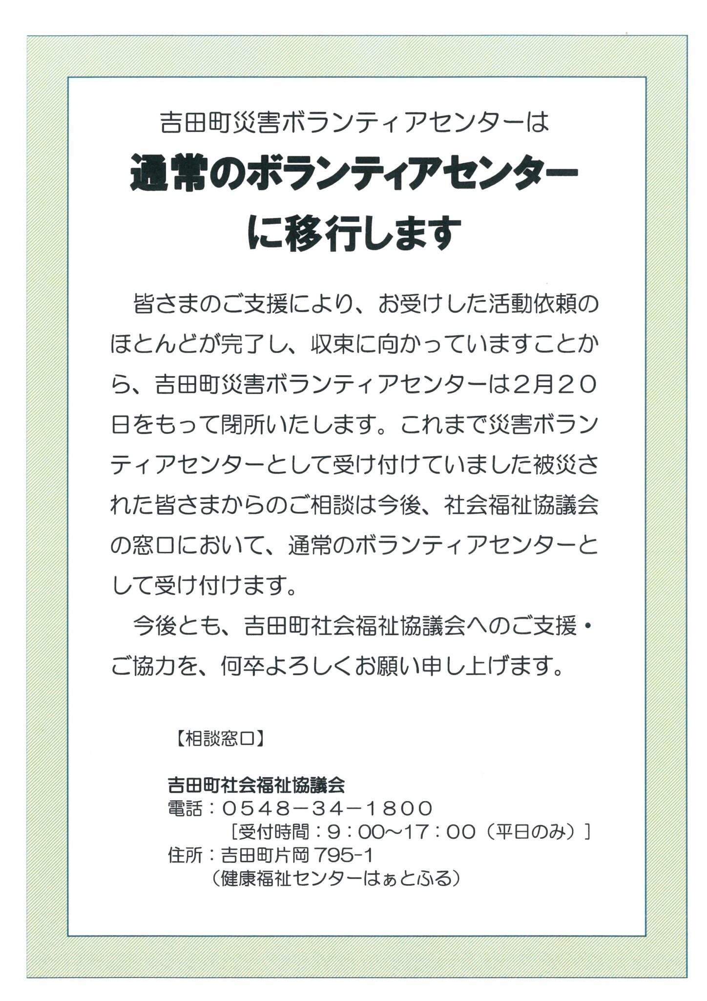 吉田町災害ボランティアセンターの通常のボランティアセンターへの移行について